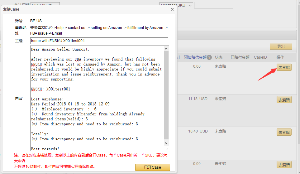將顯示索賠郵件模板, 復(fù)制生成的郵件模板到亞馬遜后臺(tái)開Case,再點(diǎn)擊 “已開Case”。